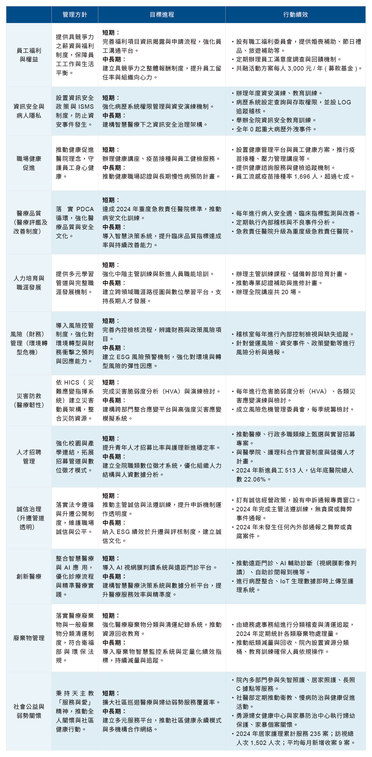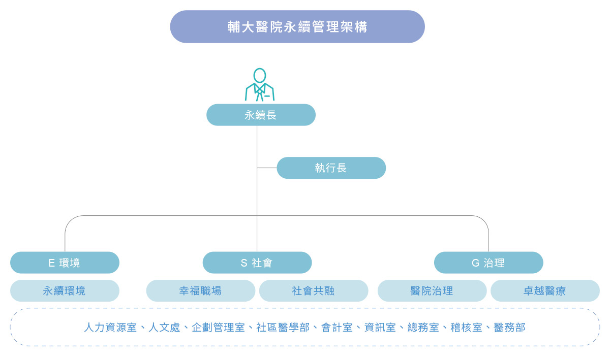 為推動永續發展,本院設有永續推展中心,並置永續長一名,由行政副院長兼任,相關業務推動由人文處統籌,負責院內永續議題之規劃與執行,定期召開會議追蹤執行進度,並將相關成果納入院務報告,每季提報董事會審閱。全年永續執行情形則整合於永續報告書,經院長核定後正式對外發布。