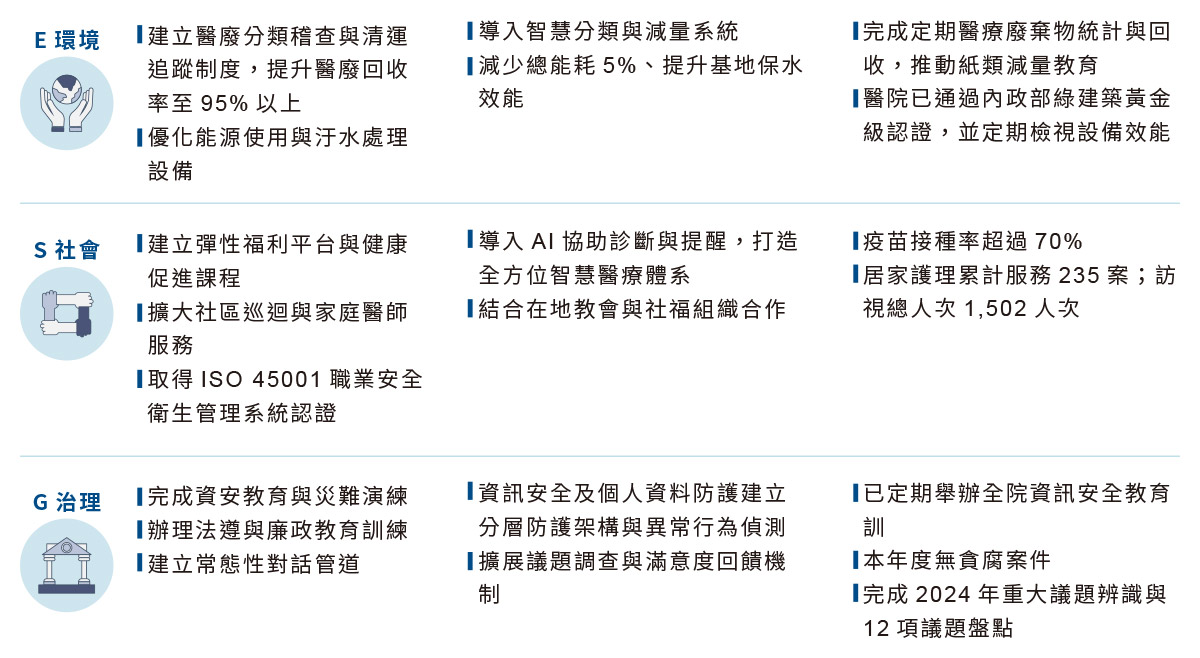 本院秉持天主教全人關懷精神,致力於推動高品質、低碳、數位化與社會共融的醫療服務,結合教育、研究與社區連結,以實踐社會責任、環境保護與良善治理,促進醫療系統的永續發展。成為兼具信仰、人本與智慧的綠色醫療典範,推動健康、希望與福祉的永續照護體系。