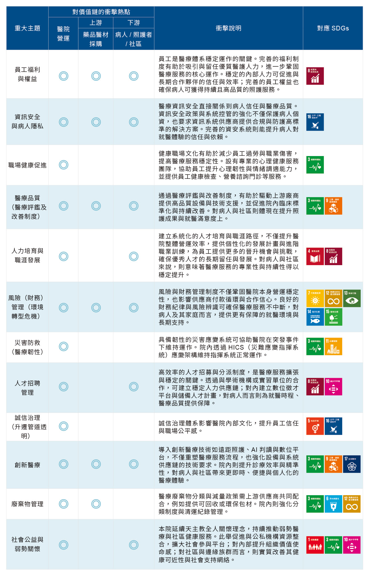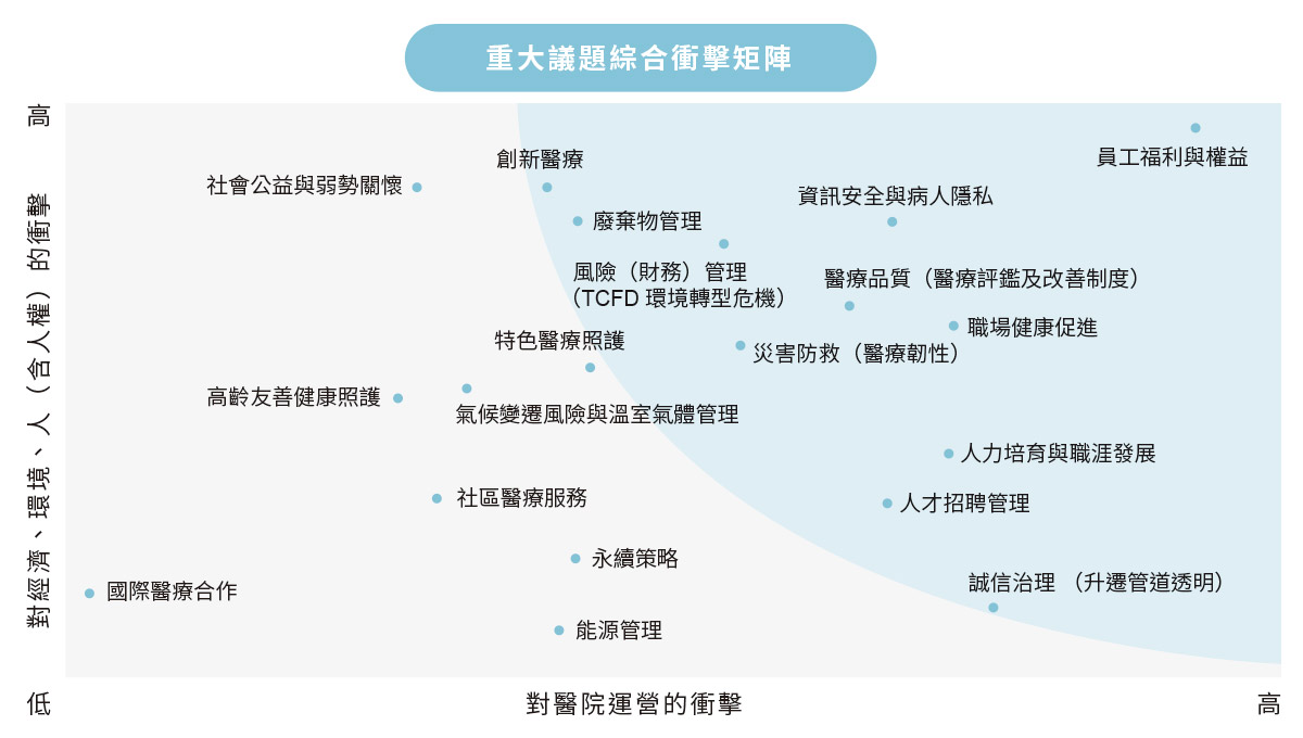 考量國際永續發展趨勢、GRI Standards之各揭露主題與醫療產業特有議題,永續推展中心彙整19項屬於本院的永續議題,包含治理、環境與社會三大面向。為決定優先揭露於報告書之內容,參考 GRI