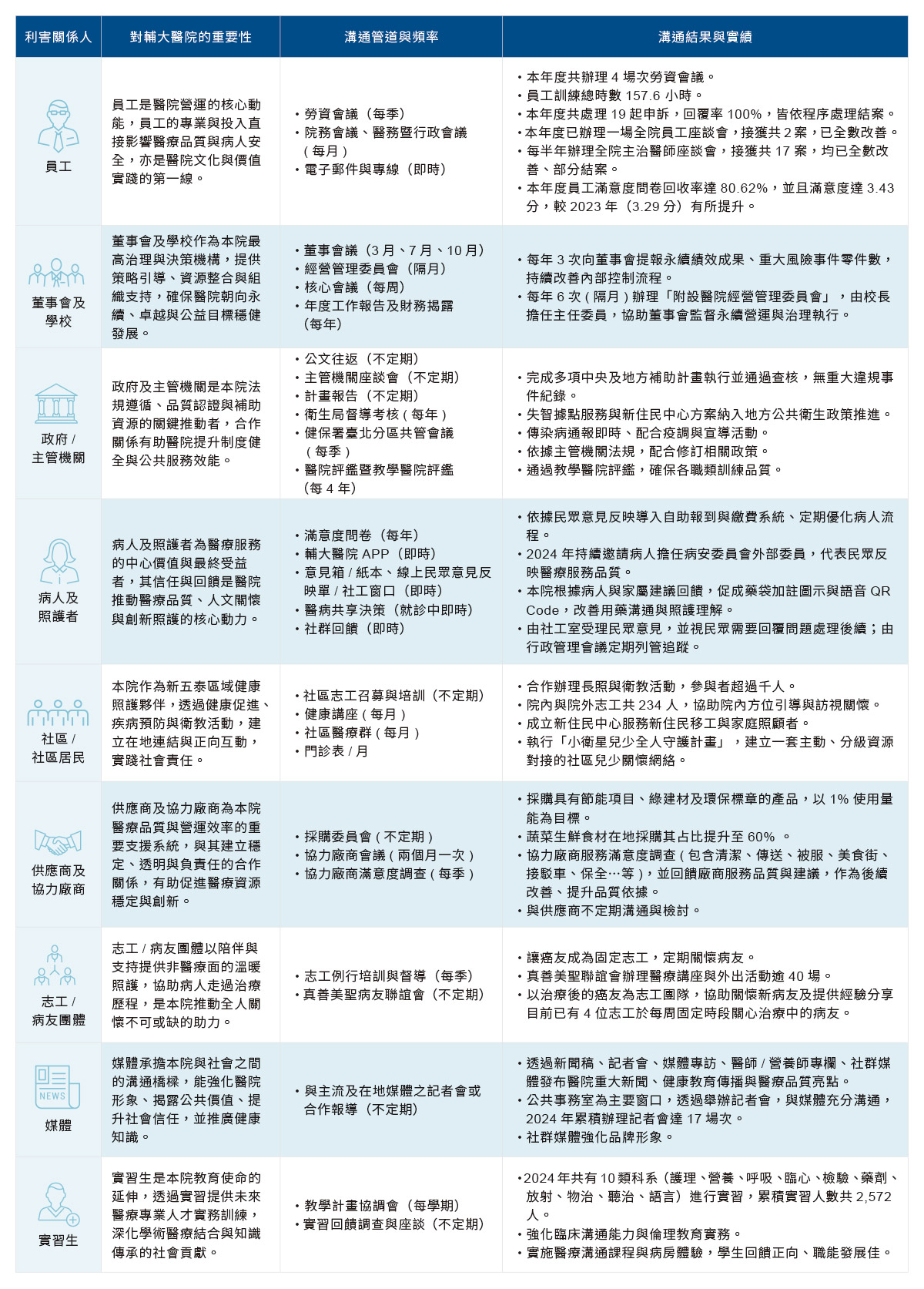 本院以各部門在日常業務中實際接觸的對象作為利害關係人鑑別的起點。2024年度本院經院內主管員工鑑別共回收80份有效問卷,針對眾多內外部關係方進行分析,進一步辨識出對本院營運影響程度最高之關係人。