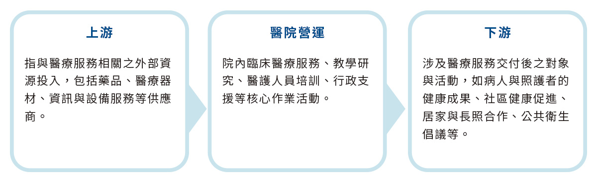 本院價值鏈範疇包含上游(藥品醫材採購)、醫院營運與下游(病人/照護者/社區)。