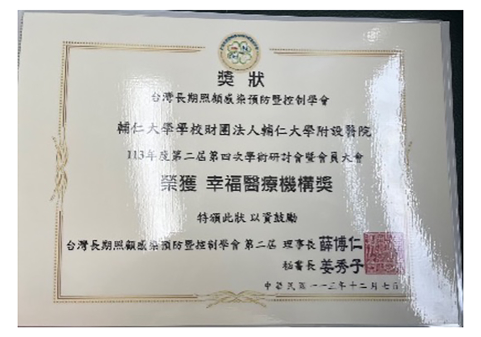 為展現輔大醫院在感染防治與長期照護品質之卓越表現,本院參加「台灣長期照顧感染預防暨控制學會」舉辦之「2024年度第二屆第四次學術研討會暨會員大會」,並榮獲「幸福醫療機構獎」殊榮,肯定本院於感染管制、照護環境優化及感管人才培育等面向之持續努力與成效。