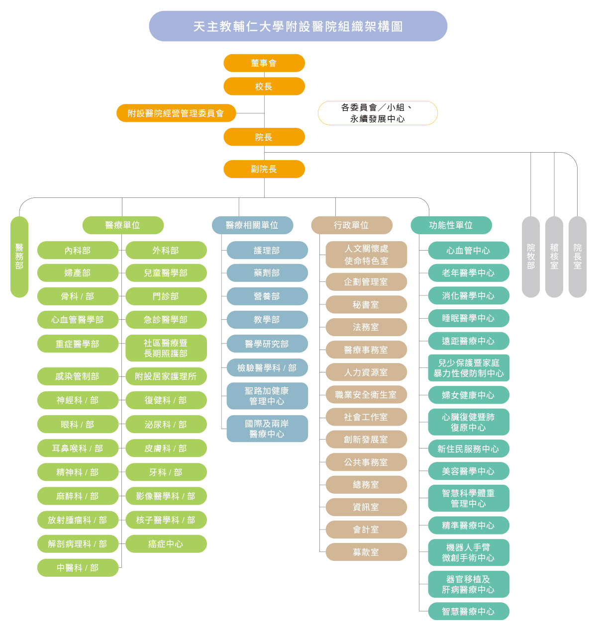 輔大醫院之最高監督治理單位為輔仁大學董事會,由校方組成附設醫院經營管理委員會予以醫院督導,由治理團隊及醫院經營管理團隊共同透過團隊協作模式,完善規劃組織架構與指揮體系,並建立內部監督、治理制度。