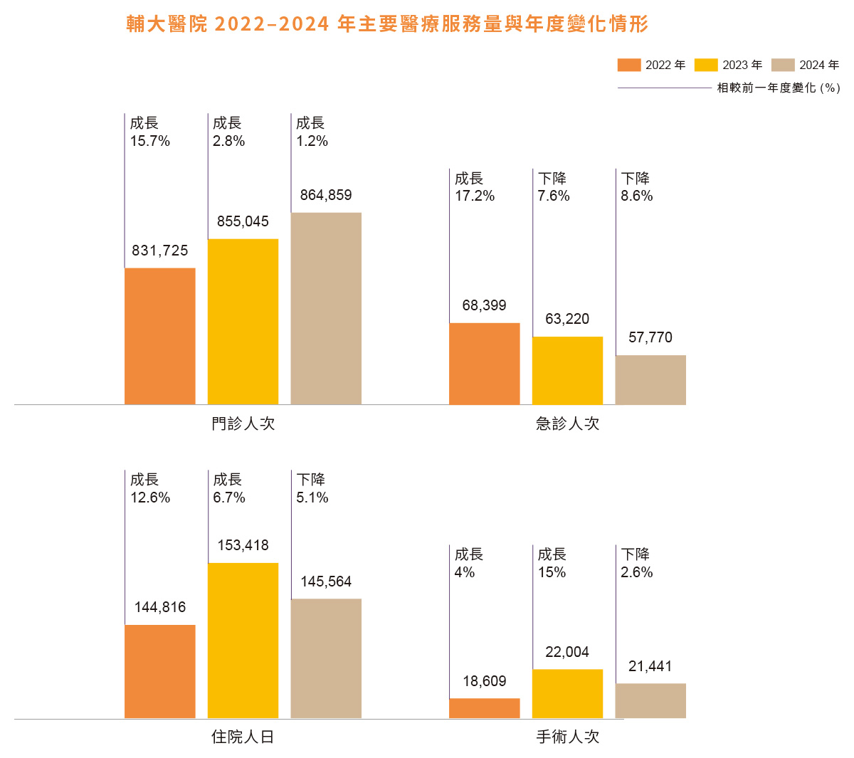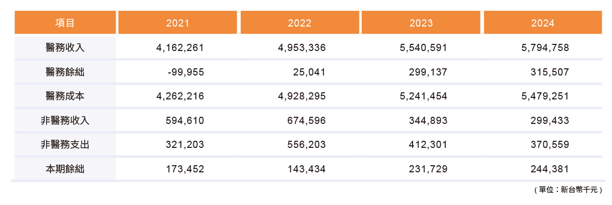 本院在區域健康照護體系中扮演關鍵角色,總病床數為671床,包含急診觀察床23床、血液透析床43床、嬰兒床10床。同年度醫療業務收入達新臺幣57.95億元,較前一年度成長4.6%,反映出穩健的營運成果與醫療服務效能。