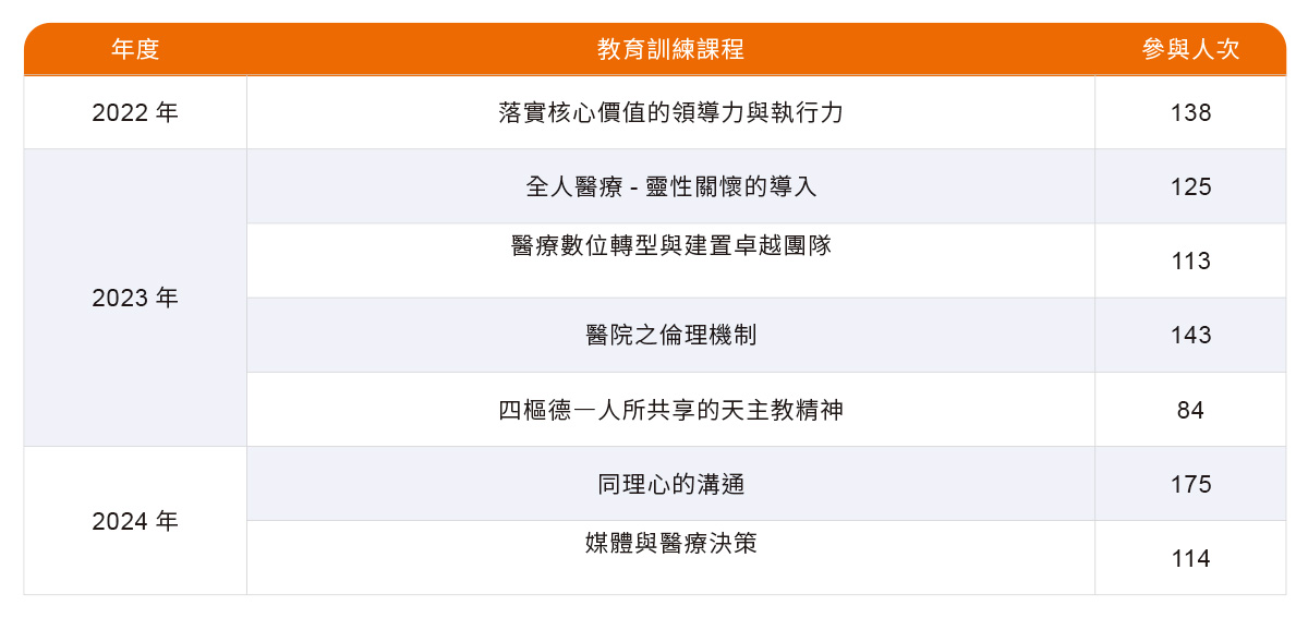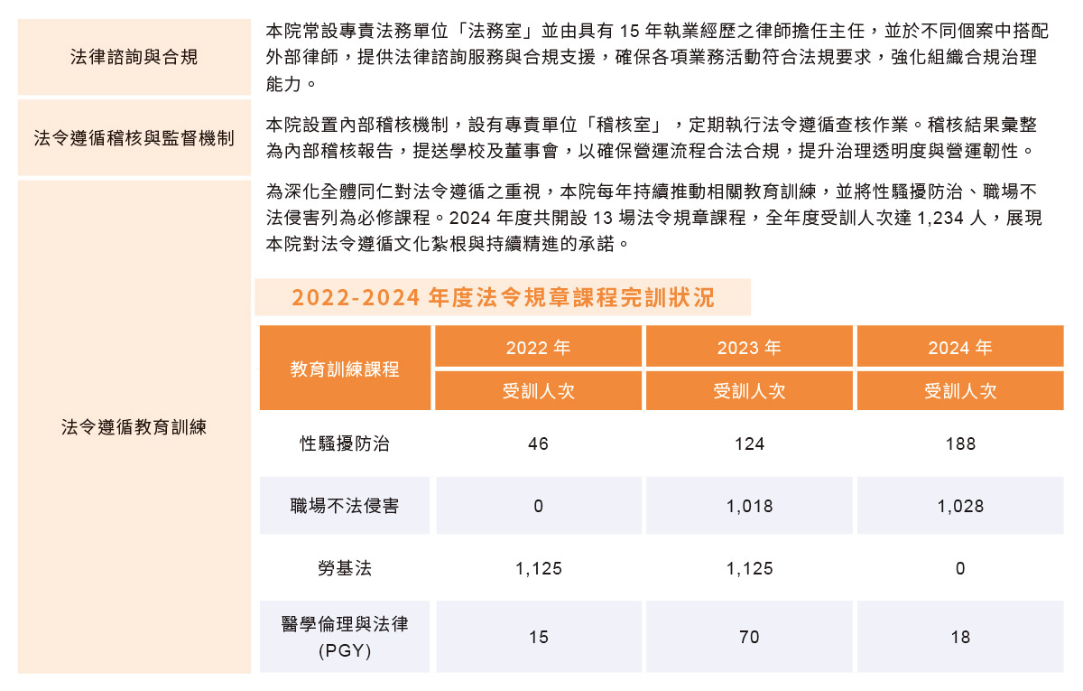 本院並定期進行檢視並更新內部控制制度各項作業內容,以辨識與控管潛在風險,提升整體合規效能,展現對病人、員工與社會之誠信承諾。同時,本院重視全員參與與制度落實,透過統計2022至2024年度課程完訓人次,持續追蹤訓練成效,以確保誠信經營理念向下扎根、全面推動。