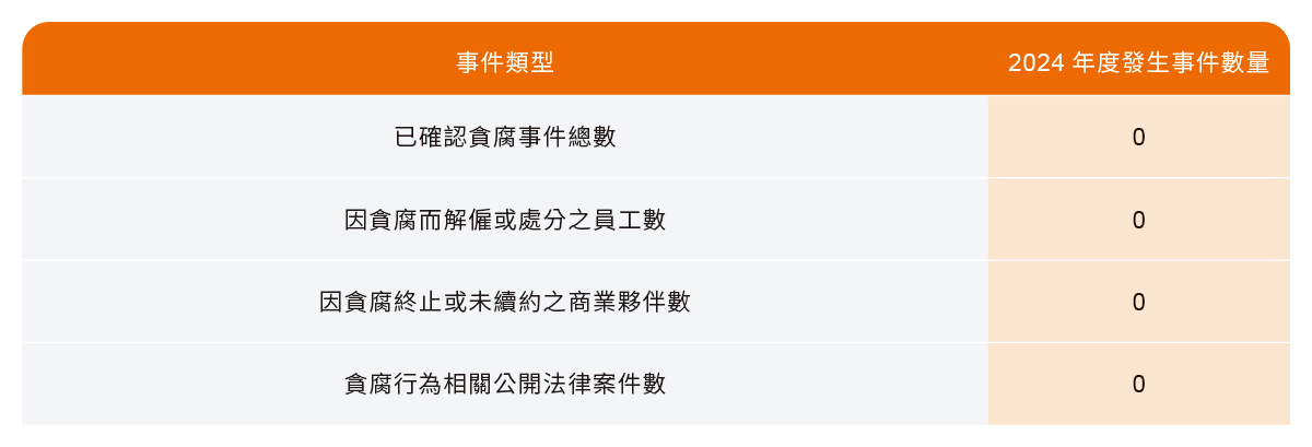 本院於2024年間,並無發生任何涉及貪腐之事件或公開法律案件。本院持續透過誠信經營之政策、教育訓練與內控內稽的機制,加強防範並杜絕不法行為,以維護組織清廉與專業聲譽。