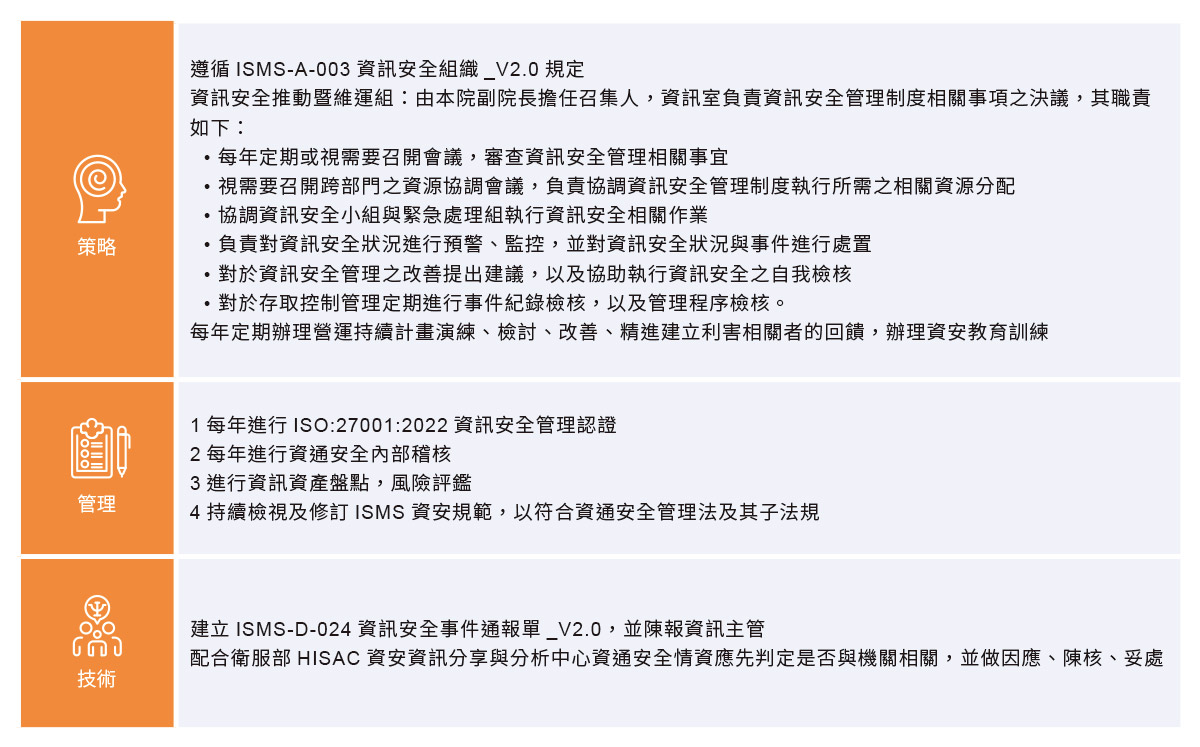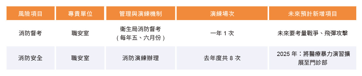本院亦設有災害管理專責單位職業安全衛生室,並成立風險危機管理委員會,依據國內外災害風險趨勢及環境變遷所帶來的挑戰,共同進行風險辨識與等級評估,並經委員會審議後,納入管理範疇並制定對應之控制策略。