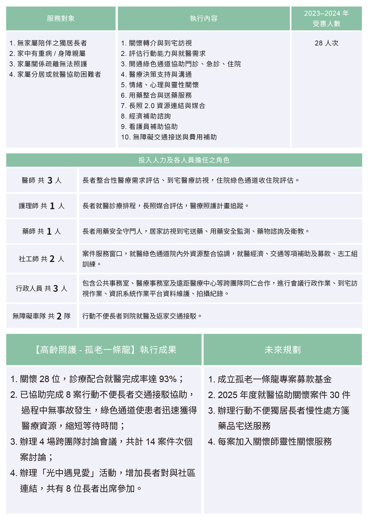 自2023年7月起,針對社區中之獨居、弱勢或高風險長者,本院推動跨專業整合之「孤老照護一條龍」專案,結合醫師、護理師、藥師、社工師及行政團隊等資源,組成行動醫療服務團隊,透過定期與不定期之居家訪視,主動關懷長者生活狀況、協助醫療就診及用藥管理。並提供「獨居長者就醫綠色通道服務」專案,建置綠色通道服務,發展社區機構網絡合作平台,結合無障礙車隊提供行動不便長者接駁服務,維護長者就醫基本權利,提升獨居長者身心健康。