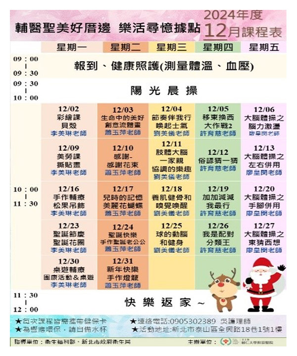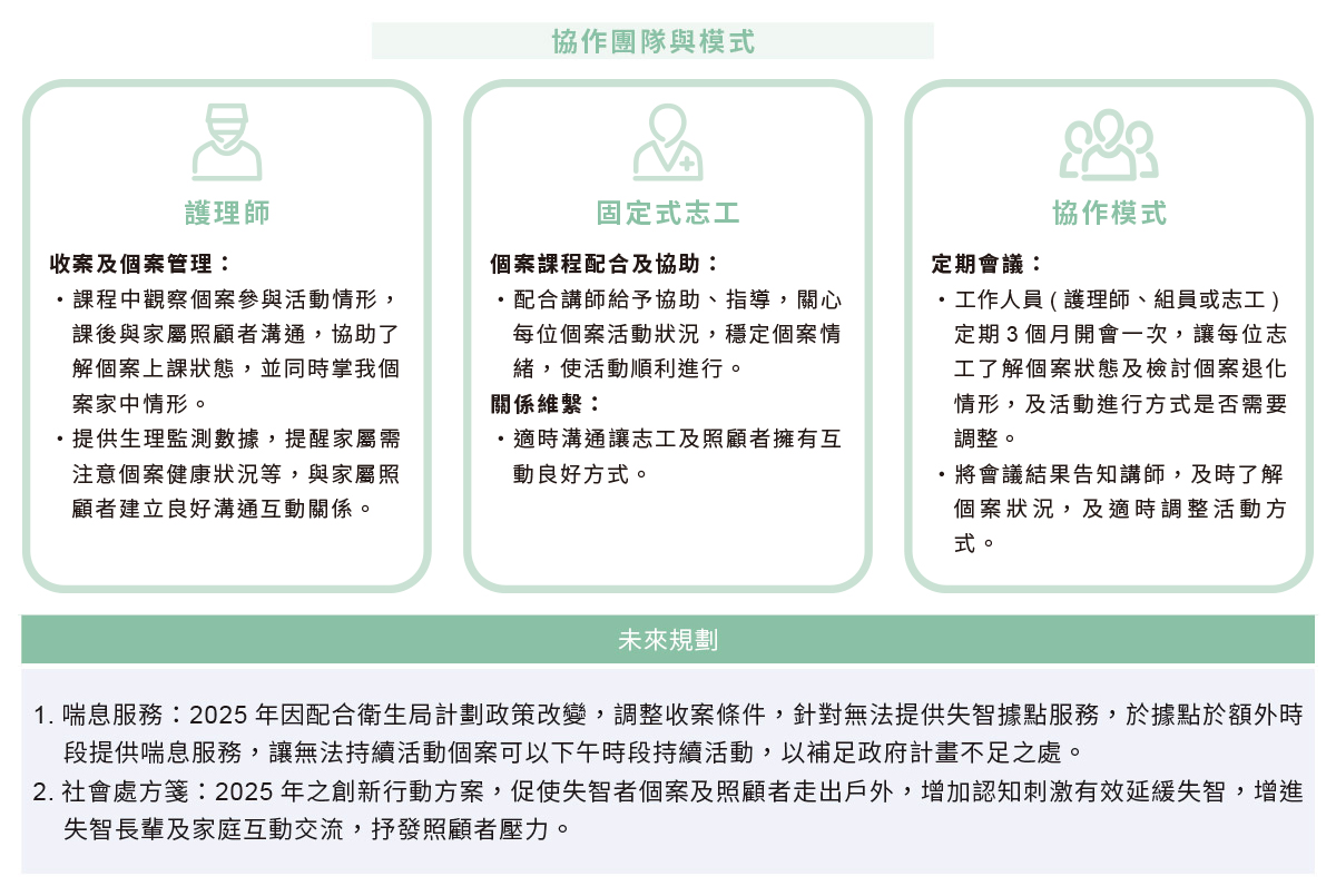 為推廣「失智症早期診斷、早期治療」理念,並強化社區照護資源,本院致力於建立標準化的失智症照護流程,實現在地化與永續經營之目標。本院積極建構失智共照網絡,提供延緩失智、認知促進、家庭支持團體、照顧技巧、供餐活動等服務,減緩失智者功能退化,並教導照顧者照護技巧等。2024年共照顧20個失智家庭,並辦理照顧者支持團體等課程,共服務逾1,000人次,協助家庭強化照顧知識與溝通能力,有效延緩長者退化進程,實踐以家庭為主要項目之整合照護模式。