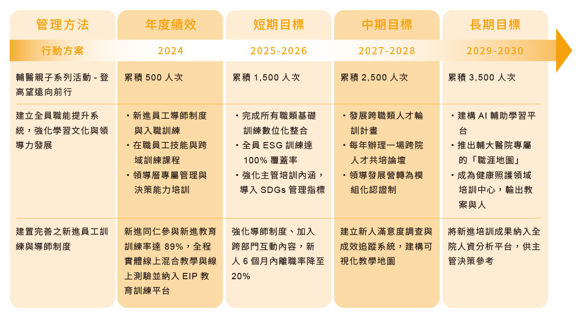 - 新進同仁:完善的入職訓練與導師制度,幫助其快速融入團隊,熟悉醫院文化與工作流程。