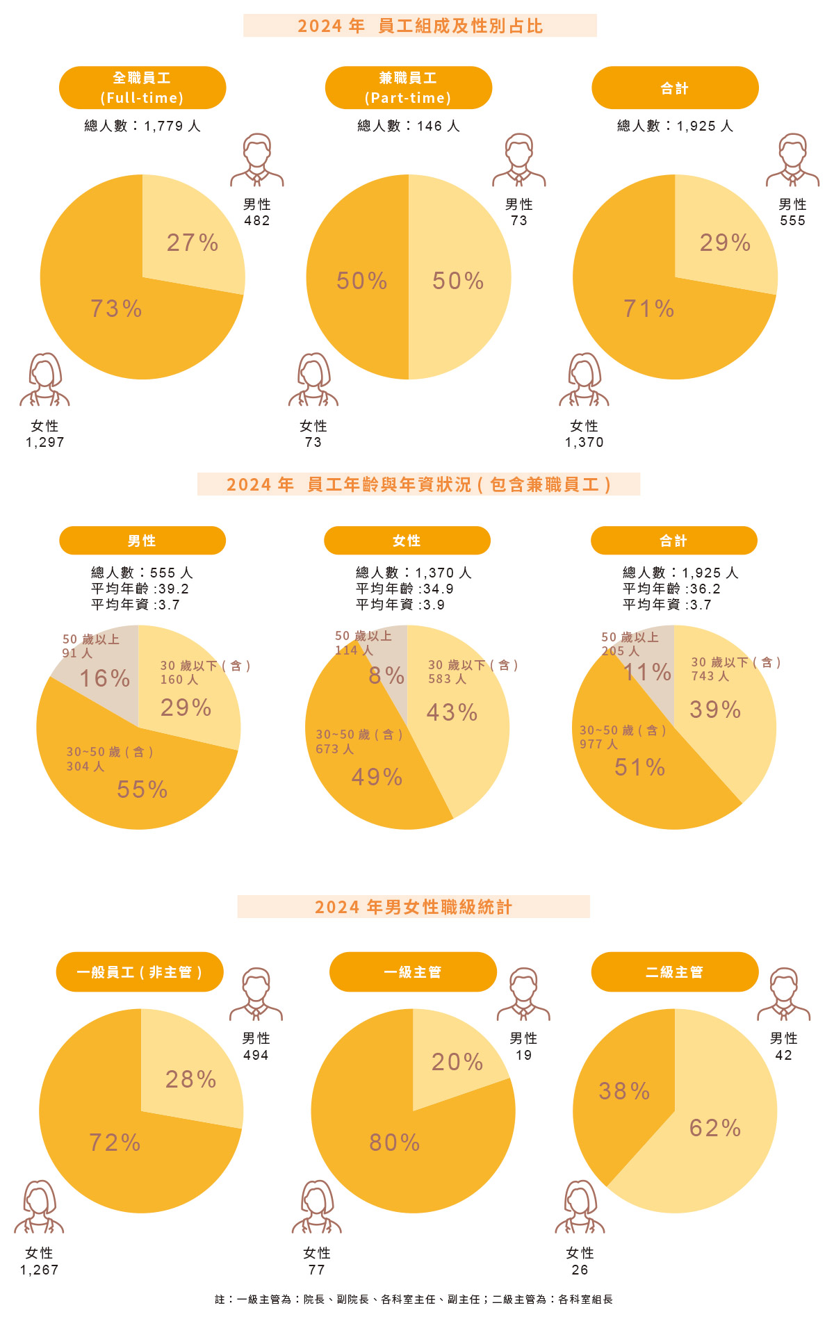 - 人力基礎穩定:全職人員占比逾九成,兼職人員146人