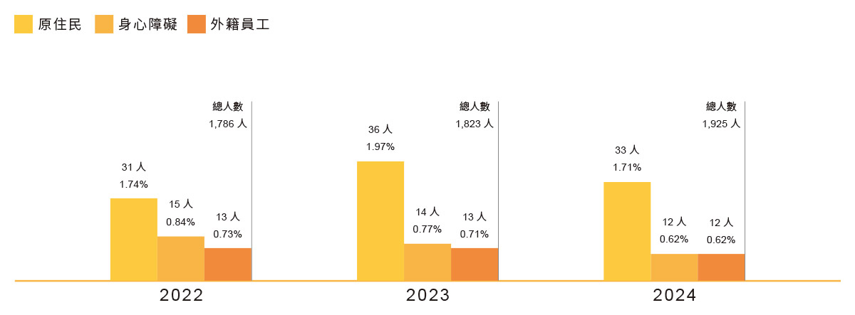 - 多元包容職場:身心障礙者 18 位、外籍人士 18 位及原住民44位