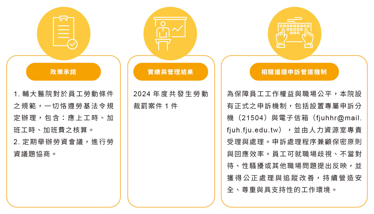 (02-85128888#21504)、電子郵件(fjuhhr@mail.fjuh.fju.edu.tw)及意見箱。2024年共有19起申訴事件,皆已由負責單位進行相關處理,回覆率達100%。