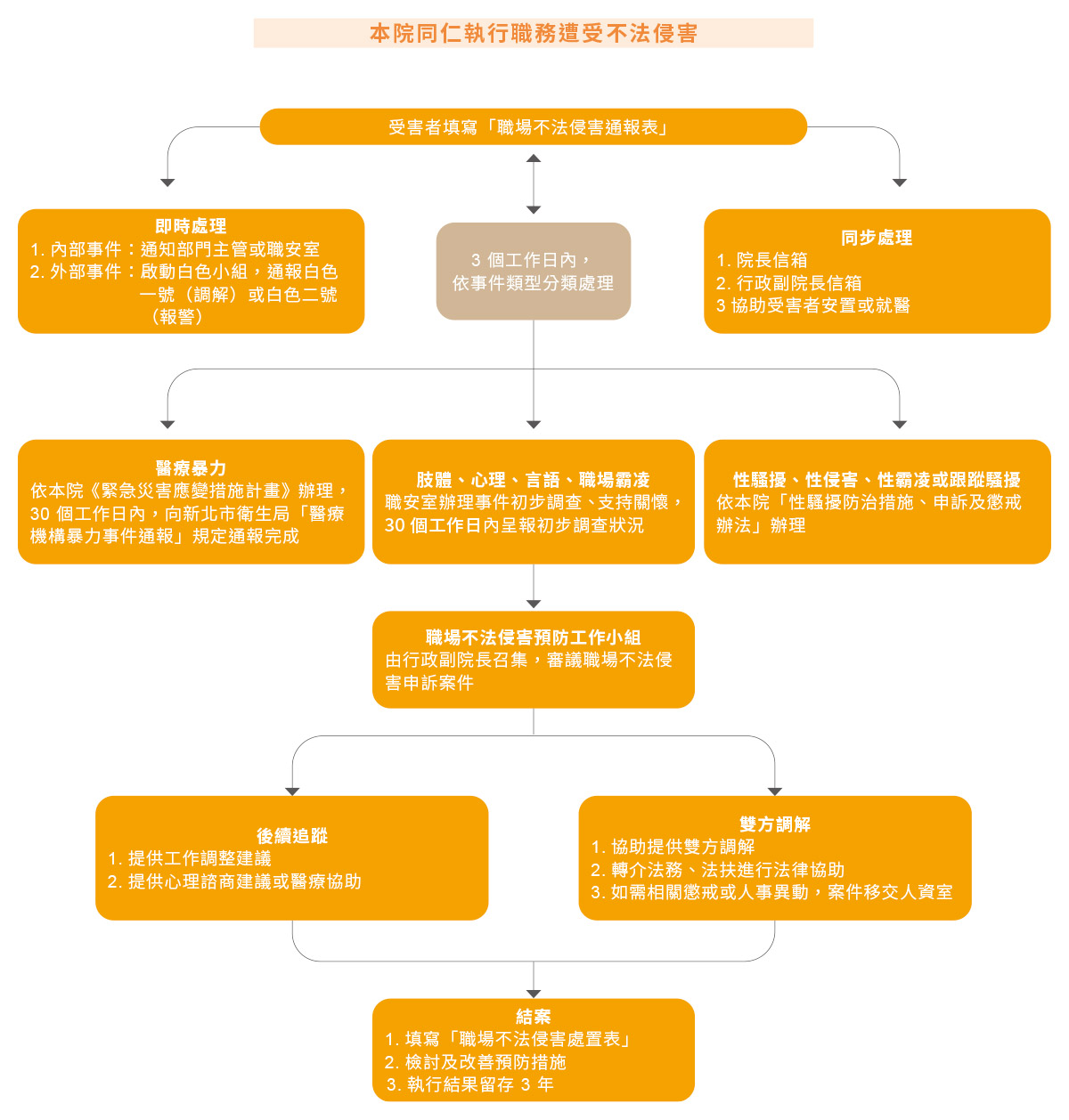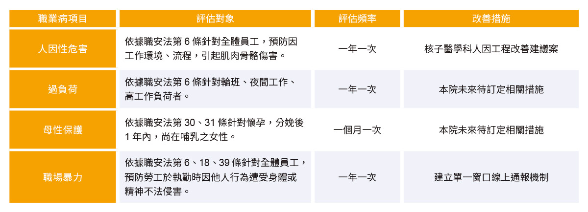 本院致力於守護每位員工的職場安全,對於院內可能影響人員健康與安全的高風險區域,皆由各權責單位負責進行風險辨識、妥善規劃與管理,並於每年定期向「職業安全衛生委員會」報告執行情形。