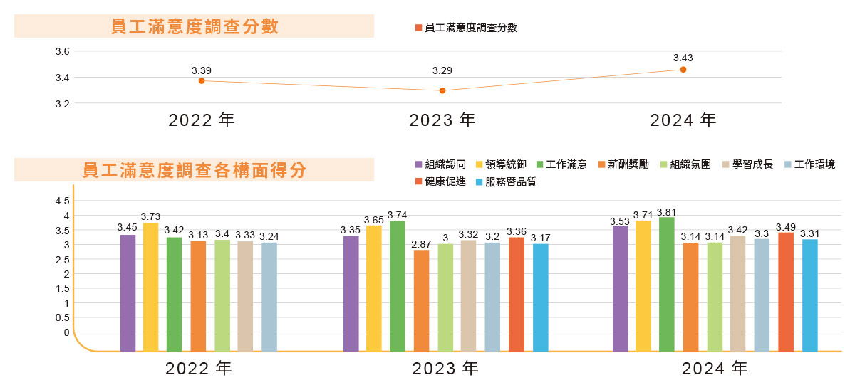 2024年問卷調查回收率達44.89%,調查結果顯示,員工對「工作滿意度」項目給予最正向評價,惟「組織氛圍」得分相對較低,為後續重點改善方向。