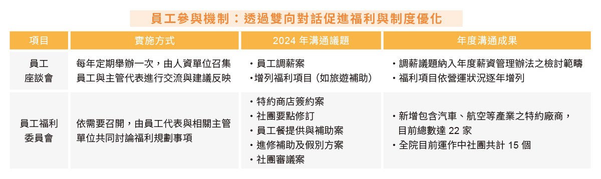 2024 年召開四次勞資會議:討論並回應員工關注事項,範疇涵蓋福利制度、工作條件、場地資源與意見回饋機制等