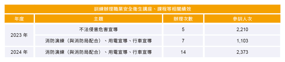 - 透過教育訓練、宣導活動及實地演練,強化員工對安全衛生的認知與實踐能力