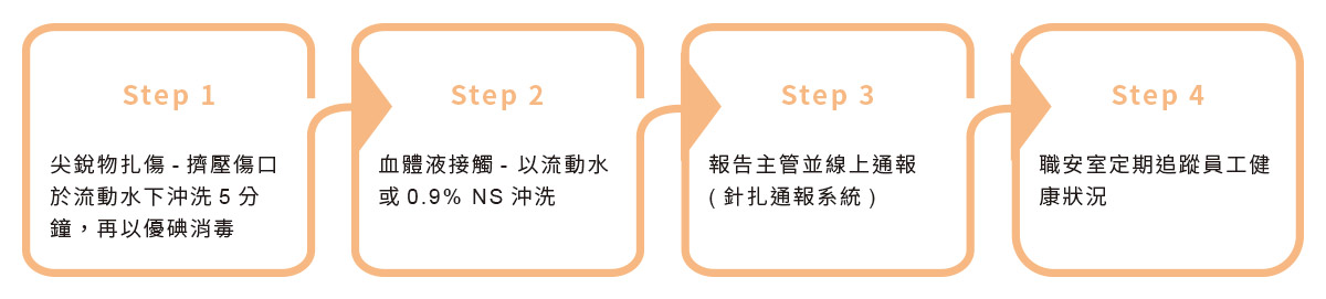 本院由感管部負責針扎事件的通報與調查,每起事件均依照標準作業程序(SP-6800-15001 醫療尖銳物品/血體液曝觸處理感染管制作業程序)進行原因分析,並啟動改善措施。