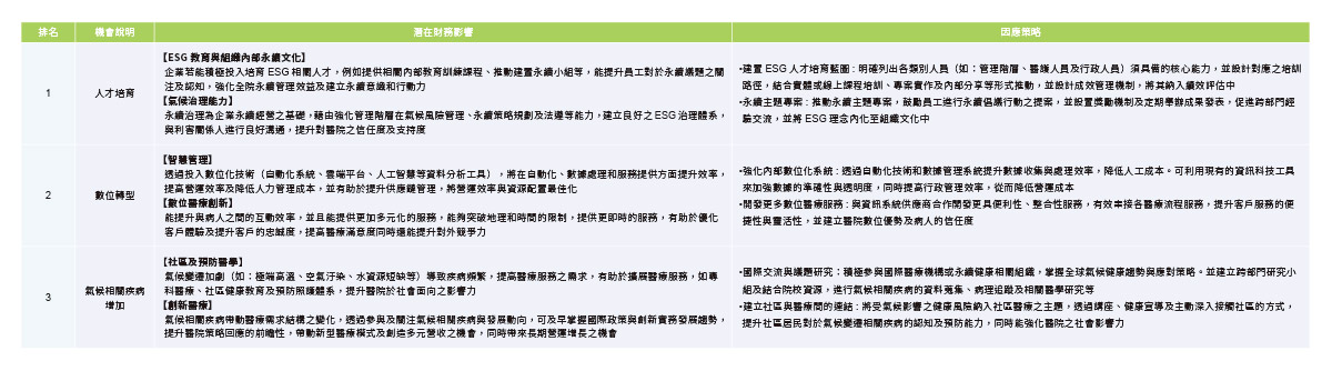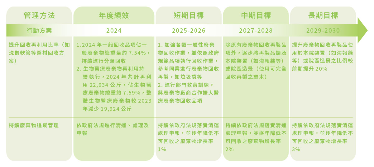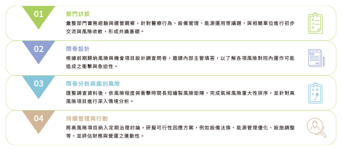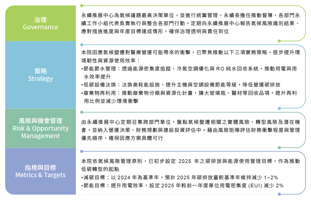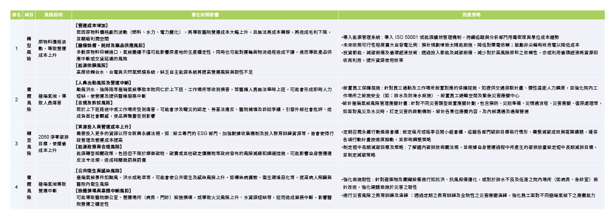 估營運與財務面之風險與機會,制定中長期碳減量目標,逐步邁向 2050 淨零醫院目標。