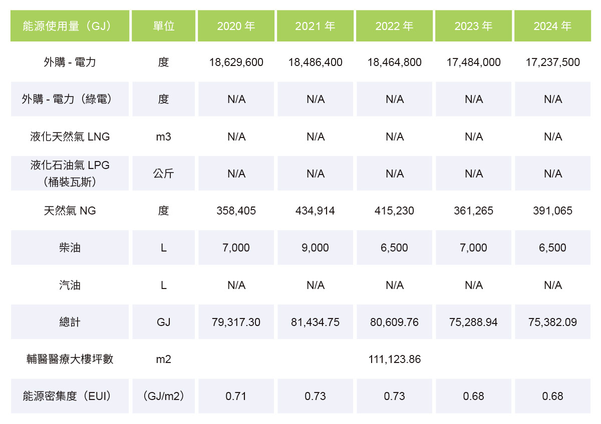 為掌握能源使用概況並持續優化管理效能,輔大醫院每年彙整院區總用電量、部門用電占比及主要耗能來源,作為能源規劃與節能改進依據。高耗能設備如冷凍空調系統、手術室與大型醫療儀器為重點關注項目,亦持續透過能耗監測系統追蹤其效能。