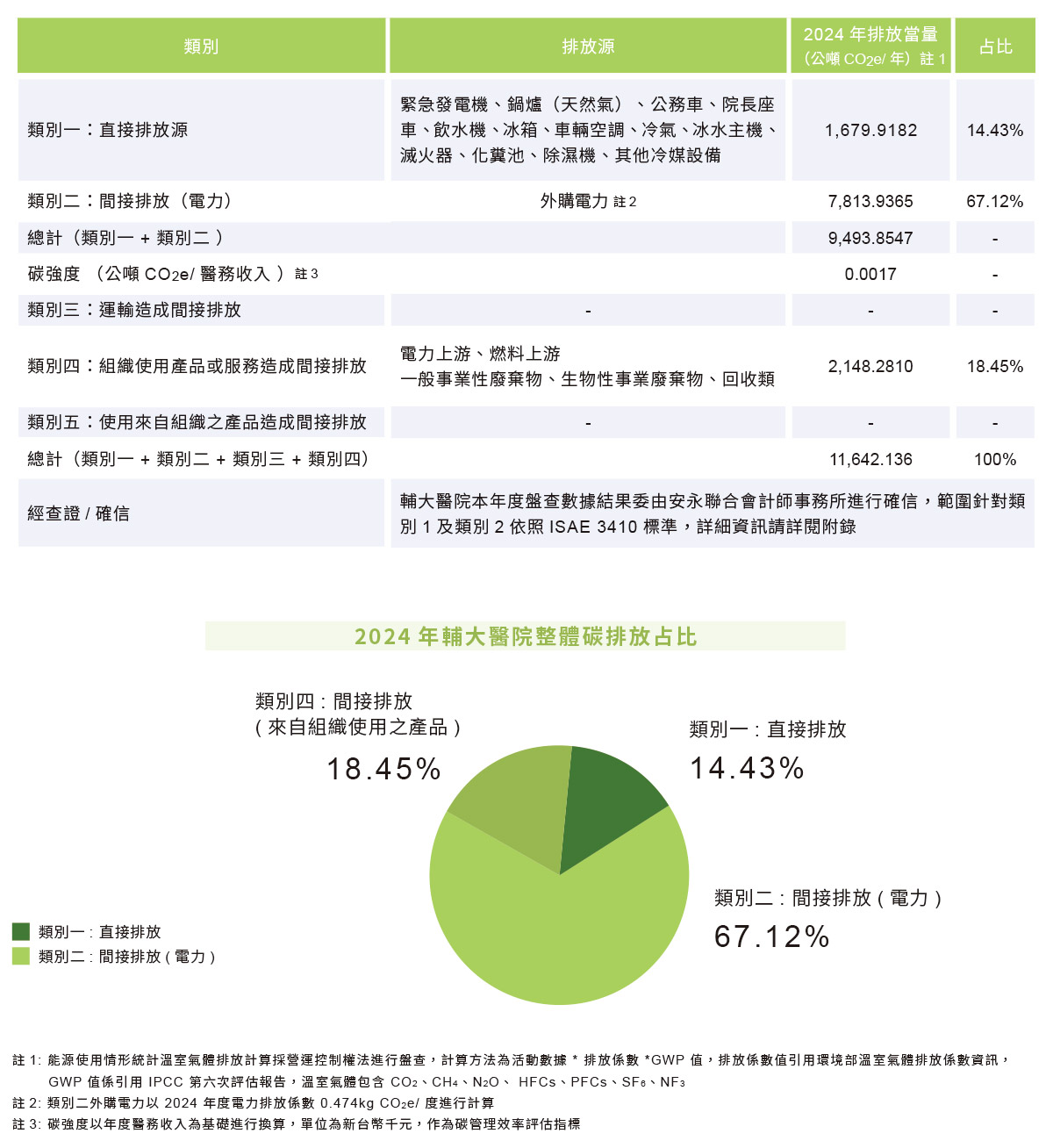 、《溫室氣體盤查議定書企業標準》與《溫室氣體盤查作業指引》等標準,盤查範疇涵蓋類別一、類別二及類別四之碳排放,以全面掌握醫療營運過程中所產生之溫室氣體影響。計算係數來源包括行政院環境部公告數值,並依據活動數據如天然氣用量、電力購買量等計算出對應排放量。