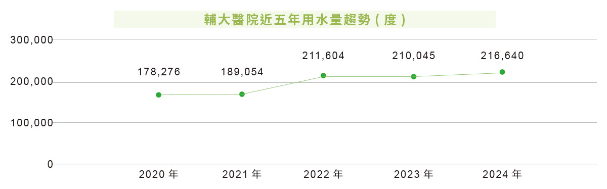 本院重視水資源永續管理,依據日常巡檢與儀表監控紀錄,定期盤點用水現況並掌握高耗水區域之變化趨勢。2024年總用水量為216,640度,主要來自第三方供水。