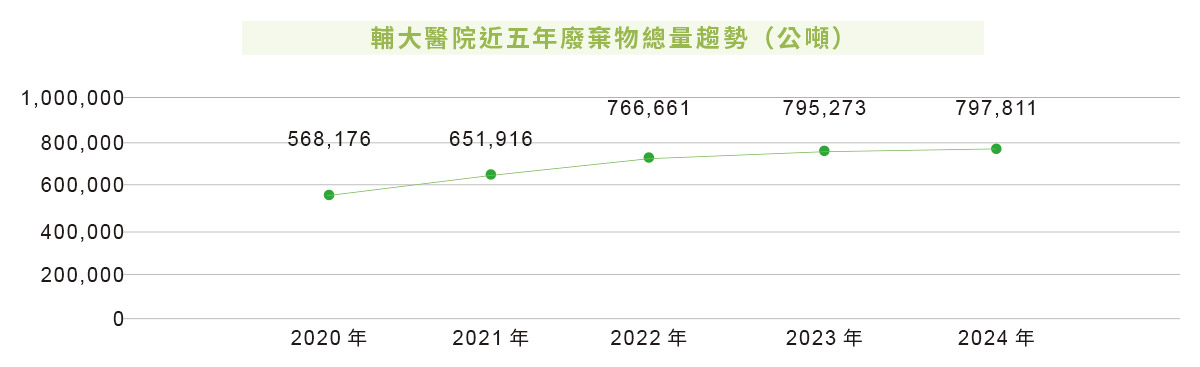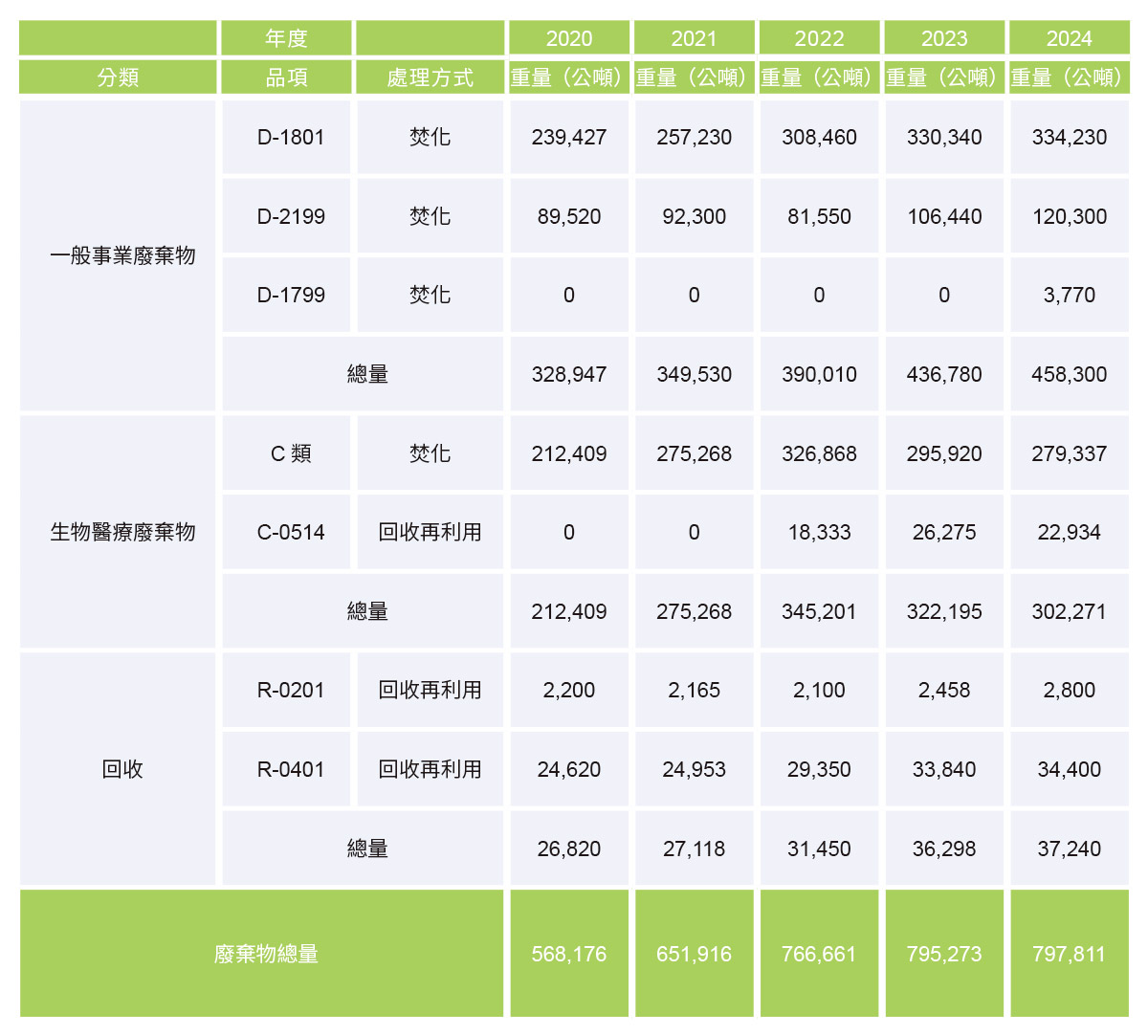 2024年廢棄物總產出量為 797,811公噸,其中生物醫療廢棄物佔比約 37.89%,一般廢棄物佔比約 57.44%,回收佔比約